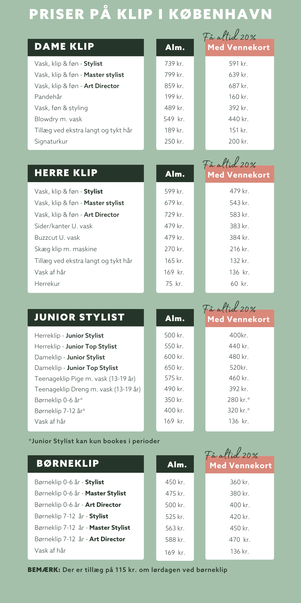 Vores Junior Stylister kan klippe både herrer og damer, og klippene er altid superviseret af andre frisører i salonen, hvorfor du altid er i trygge hænder. Junior Stylisterne assisterer frisørerne og bliver dermed dygtigere dag for dag. Nogle Junior Stylister kan også farve.